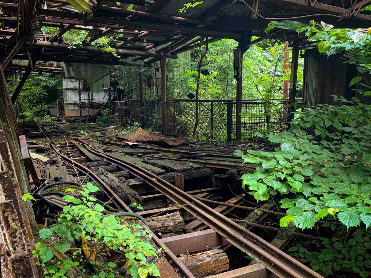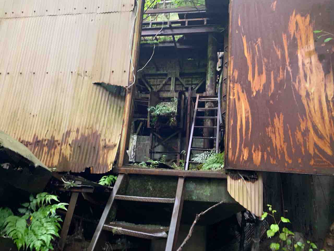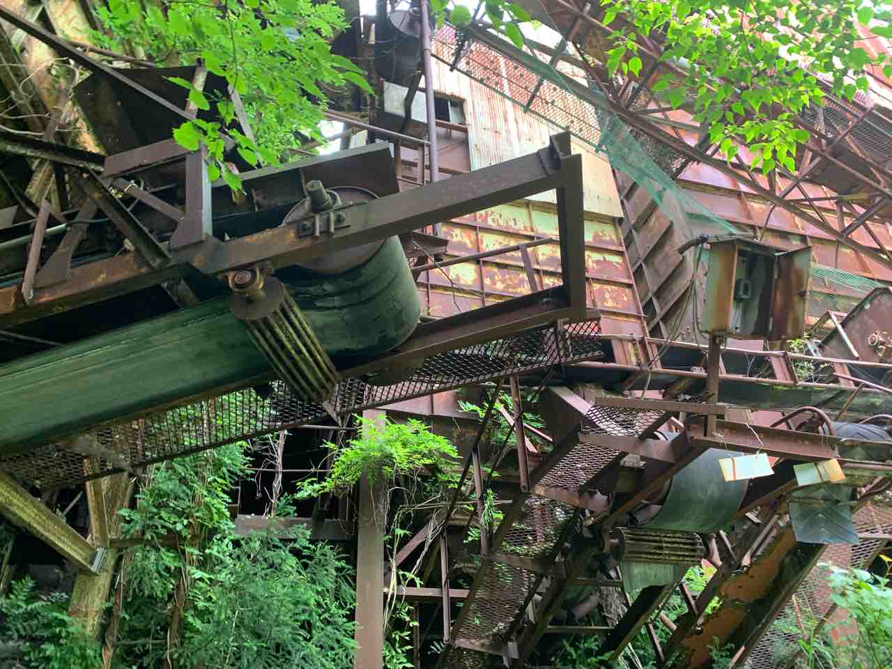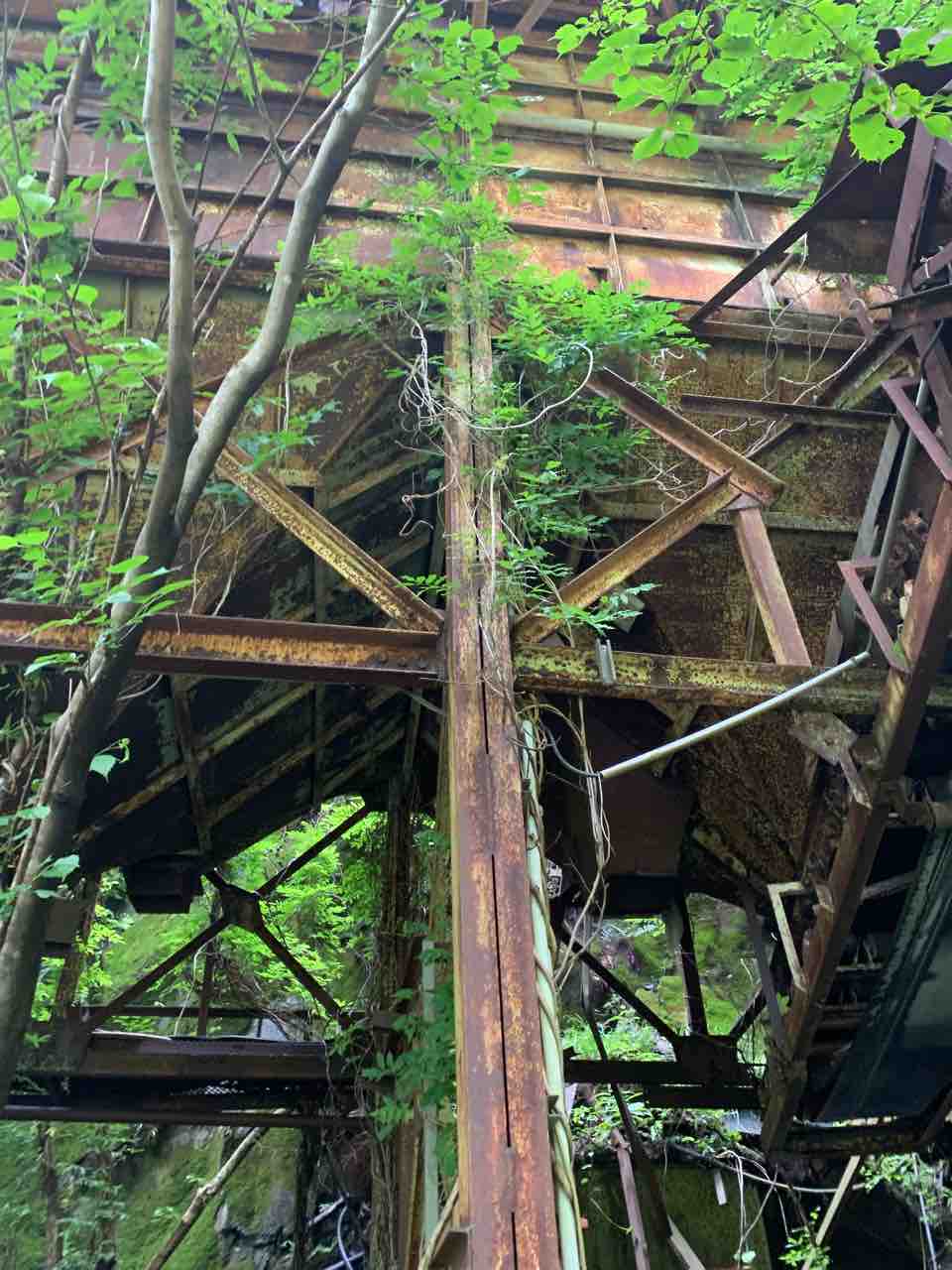 これが春日鉱山の過去の栄光かと思うと感動する、、錆びた鉄を覆う草木は廃墟に生きる生命って感じがして廃墟美を感じた。