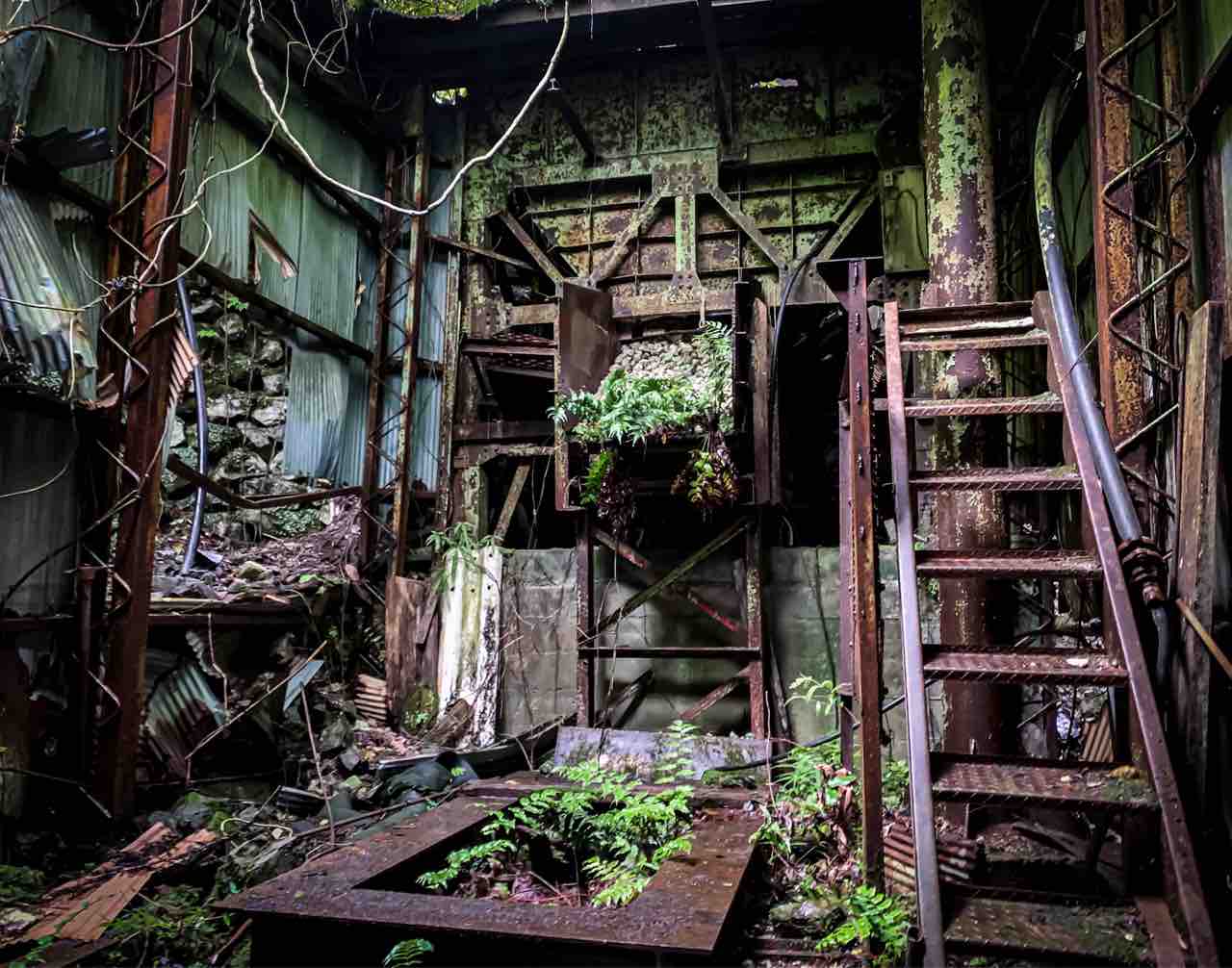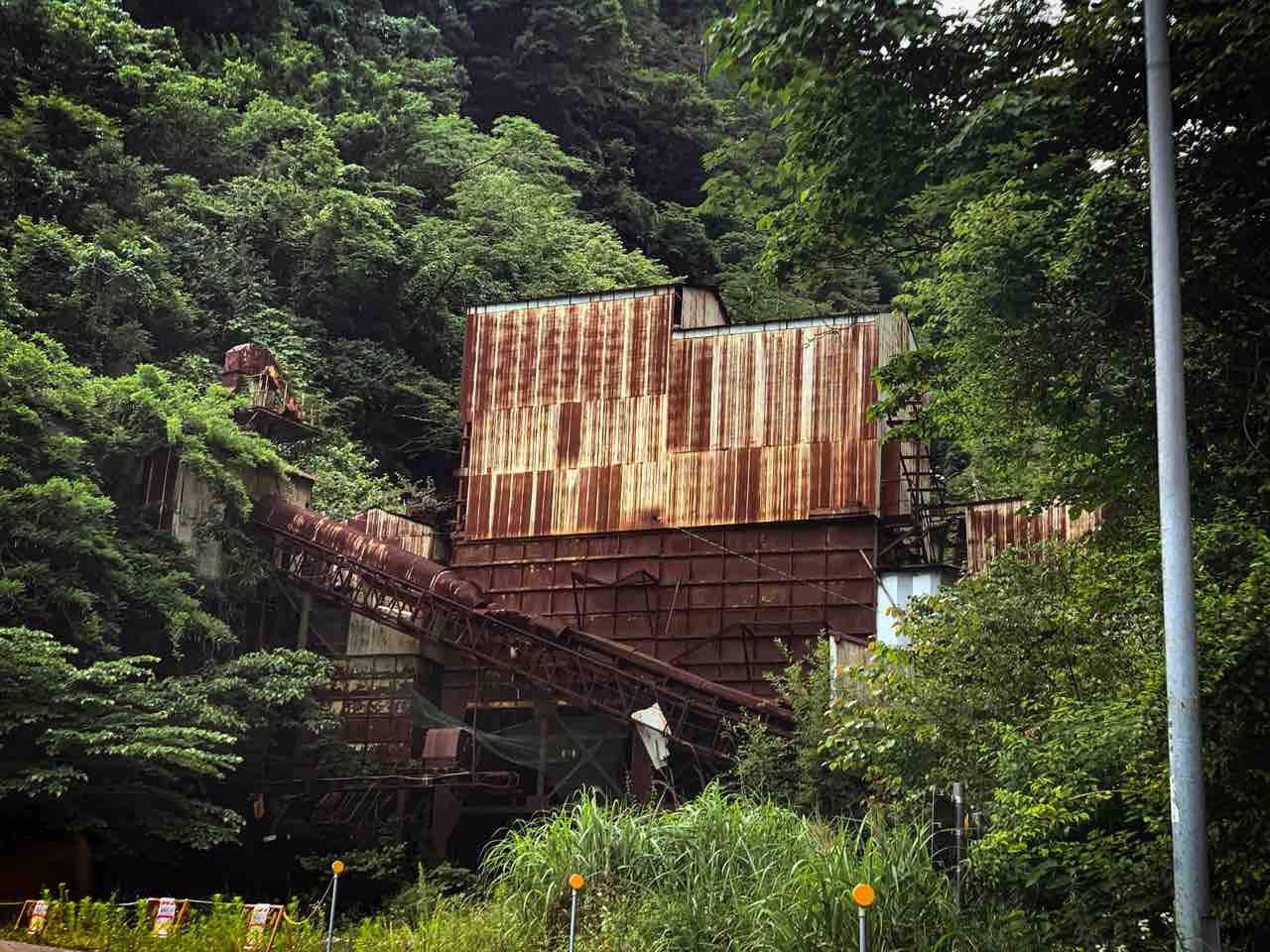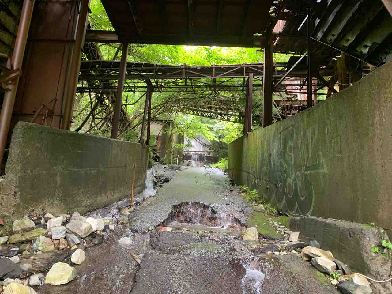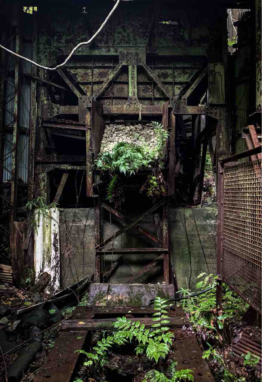 これが春日鉱山の過去の栄光かと思うと感動する、、錆びた鉄を覆う草木は廃墟に生きる生命って感じがして廃墟美を感じた。