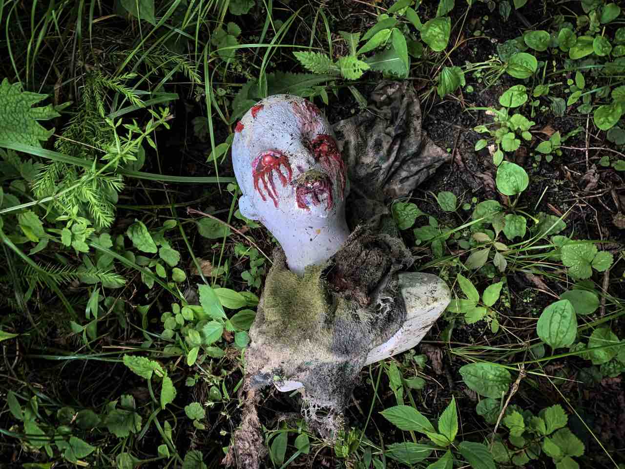 事務所とサイロがある部分に有名な人形が置いてあるのを確認したくて数分探索していたら何処にも無くて、探索を続けて居たら抗口付近で仰向けの紫色の人形らしき物を発見しまさかと思いひっくり返したら例の人形がいました。。
